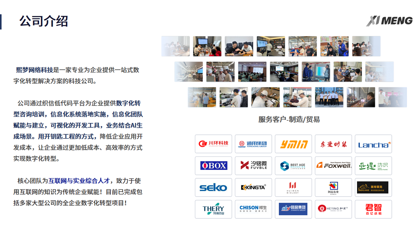 在熙梦,我们常说:数字化不是目的,是实现美好商业的手段。未来已来,只是分布不均。如果你正在思考企业的数字化之路,欢迎来熙梦坐坐,我们一起聊聊,如何让你的企业不仅活在当下,更赢在未来。