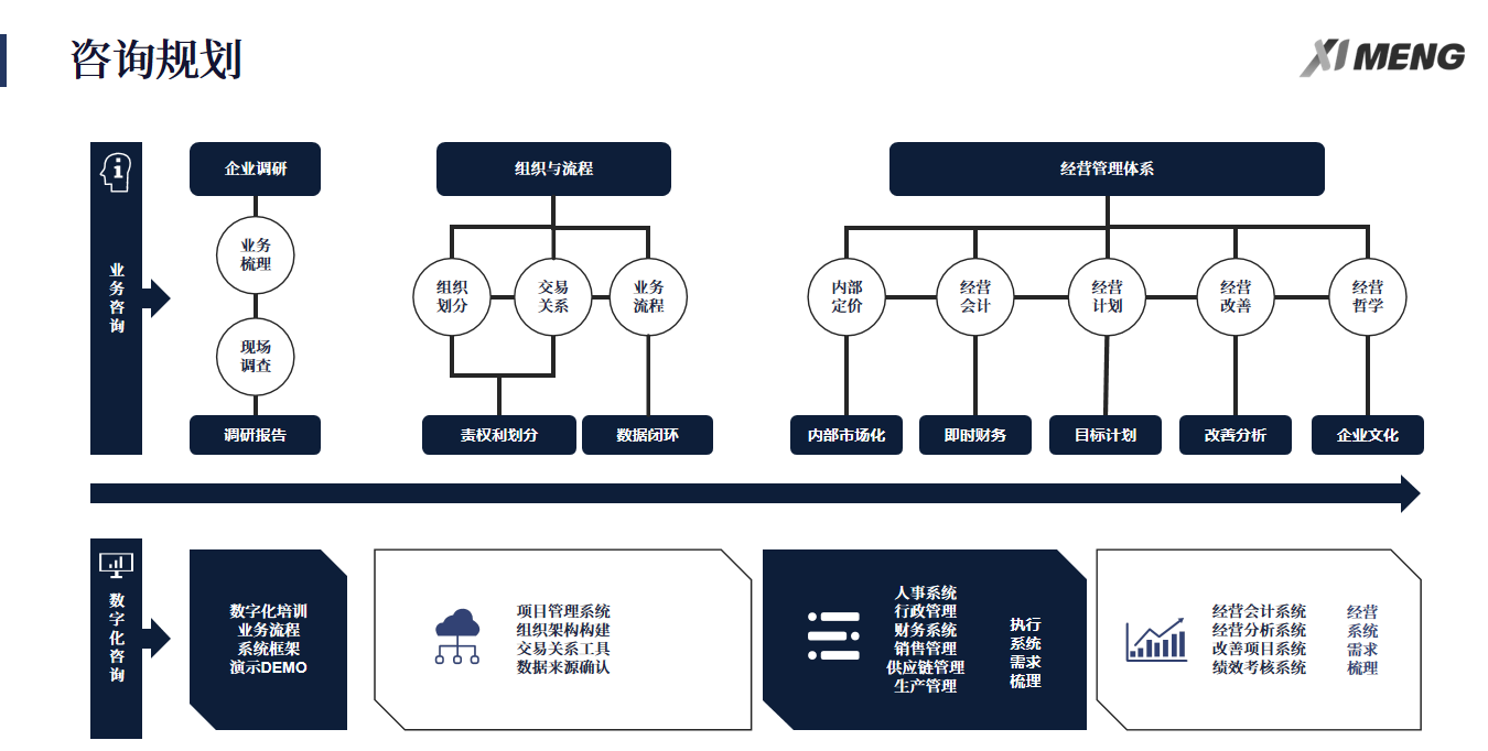 熙梦网络科技在服务客户过程中发现,真正能够走得远的数字化转型,往往始于对企业现状的深度诊断与战略对齐。只有将数字化建设纳入企业顶层设计,才能跨越“IT工具化”的局限,走向“业务数字化”和“数字业务化”的更高阶段。这也正是为什么许多企业年年在做数字化,却始终效果平平、难见成效的根本原因。