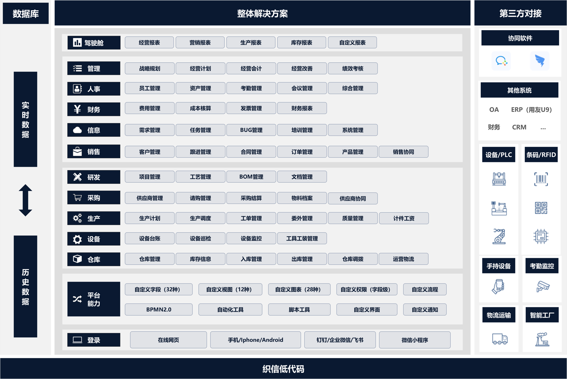 解决方案构建了覆盖企业全业务流程的数字化平台,主要包含以下核心模块: